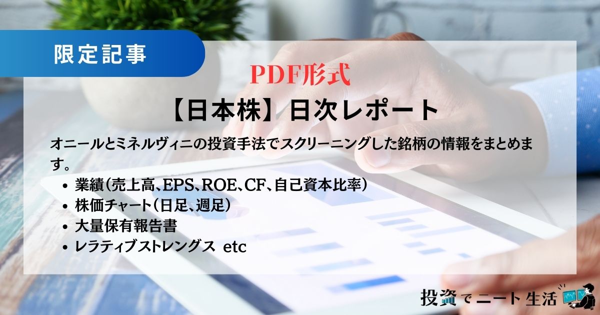 誰でもスクリーニングできるようにEXCEL形式にしたり、業績やチャートがまとめられたPDF形式で提供したりしています。
