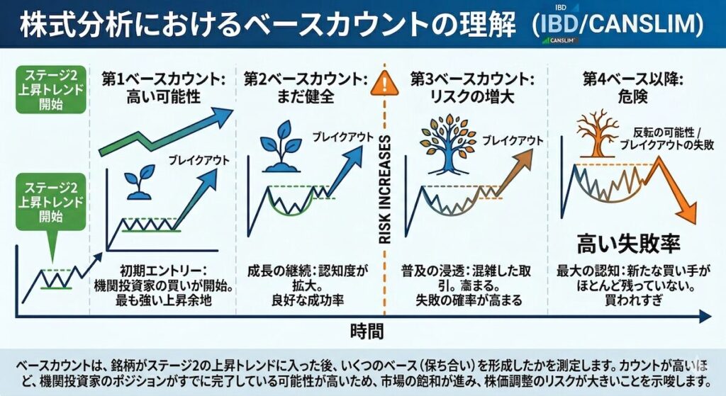 ベースカウント(Base Count)とは、ある銘柄がステージ2(上昇トレンド)に入ってから何回目のベースを形成しているかを示す数値です。