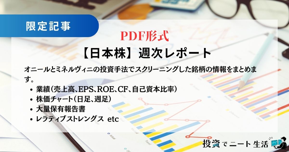 誰でもスクリーニングできるようにEXCEL形式にしたり、業績やチャートがまとめられたPDF形式で提供したりしています。