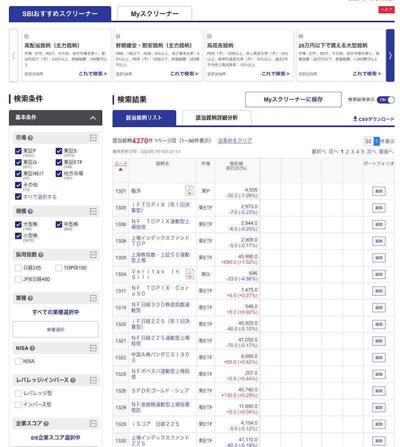 今回はSBI証券で利用できるスクリーニングツールを利用しました。