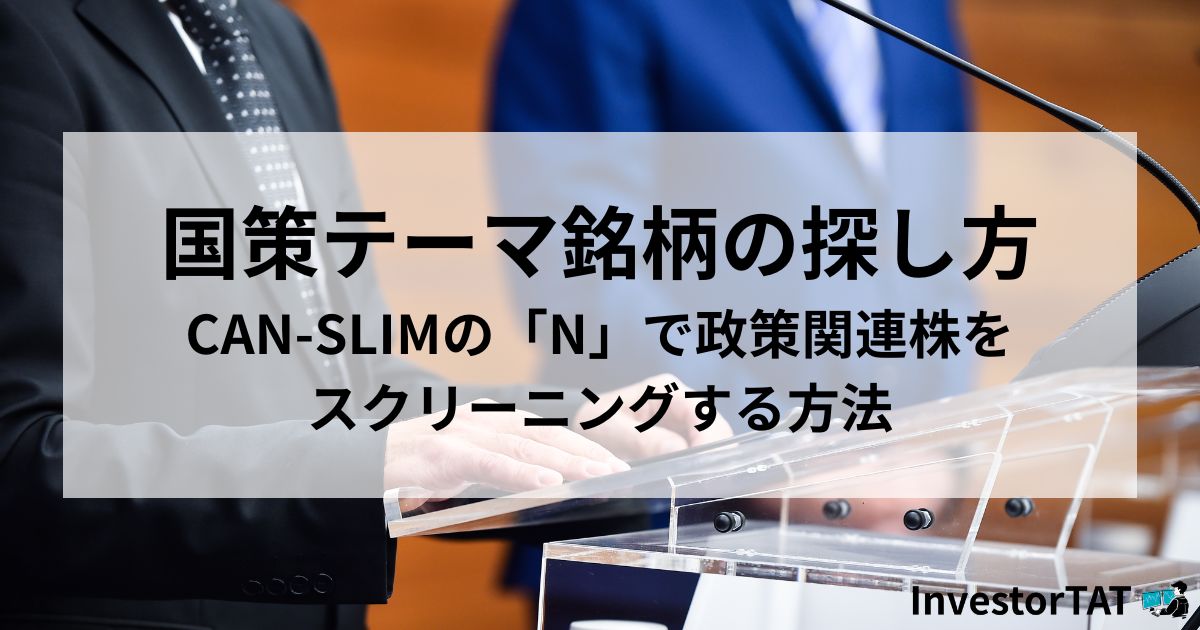 本記事では、国策テーマをCAN-SLIMの「N」(New Industry Conditions=産業の新しい状況)として体系的に位置づけ、スクリーニングの「レンズ」として活用する方法を解説します。単なる「国策銘柄リスト」ではなく、テーマ × 業績 × チャートの3軸で実践できるフレームワークを提示します。