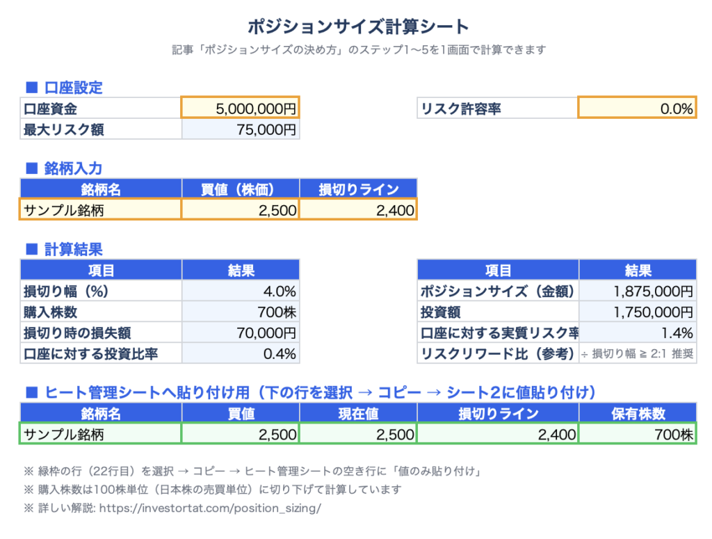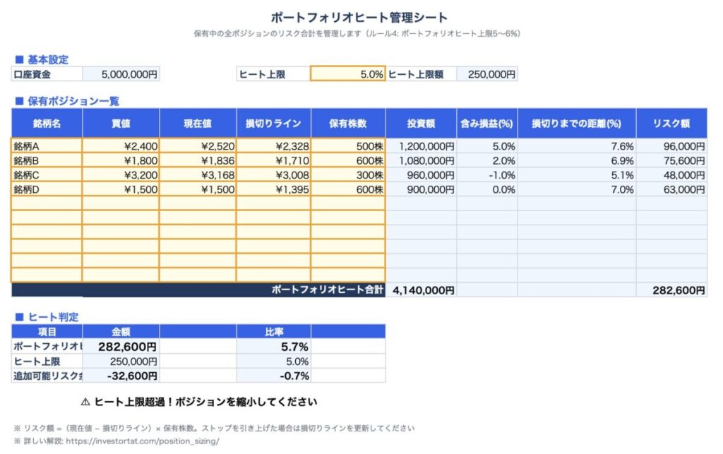 上記のステップ1〜5を自動計算できるExcelファイルを用意しました。口座資金・株価・損切りラインを入力するだけで、購入株数・投資額・実質リスク率が自動で計算されます。ポートフォリオヒート管理シート付きです。